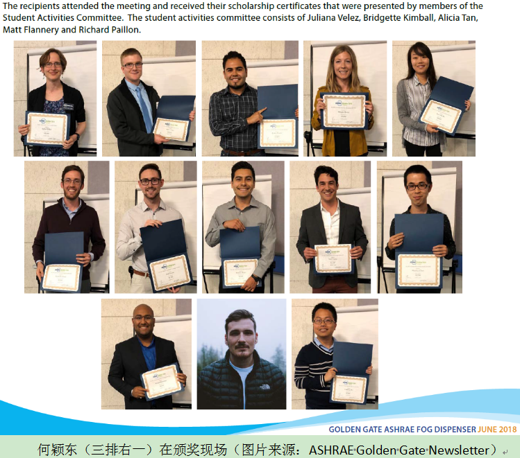 2018年5月17日,美国采暖、制冷与空调工程师学会(American Society of Heating Refrigerating and Air-Conditioning Engineer)金门大桥奖(ASHRAE-Golden Gate Scholarship)颁奖仪式在美国旧金山举办。土木学院2014级直博生何颖东凭借以“Usage, Models and Effects of Personal Comfort Systems in Buildings”为主题的研究获得美国采暖、制冷与空调工程师学会金门大桥奖,同时也是所有获奖人员中仅有的两位中国学生之一。