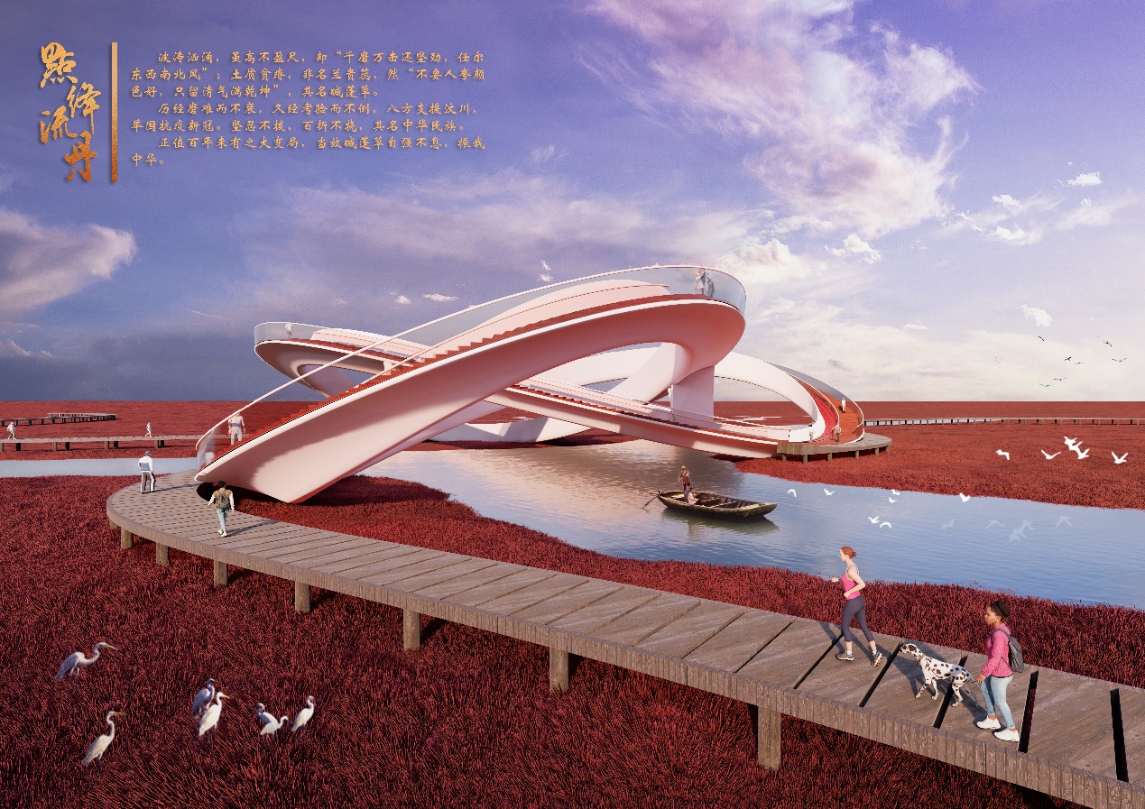 源自:点绛流丹,点绛取自江淹《咏美人春游》:“白雪凝琼貌,明珠点绛唇。”意为红海滩那一株株饱满欲滴的碱蓬草;流丹取自王勃《滕王阁序》:“层峦耸翠,上出重霄;飞阁流丹,下临无地。”意为盘旋舞动的桥梁。桥名结合了一望无际的红海滩碱蓬草景观和流畅的曲线桥型,情景交融,形成一幅生机盎然、雄奇浩瀚的自然画卷。