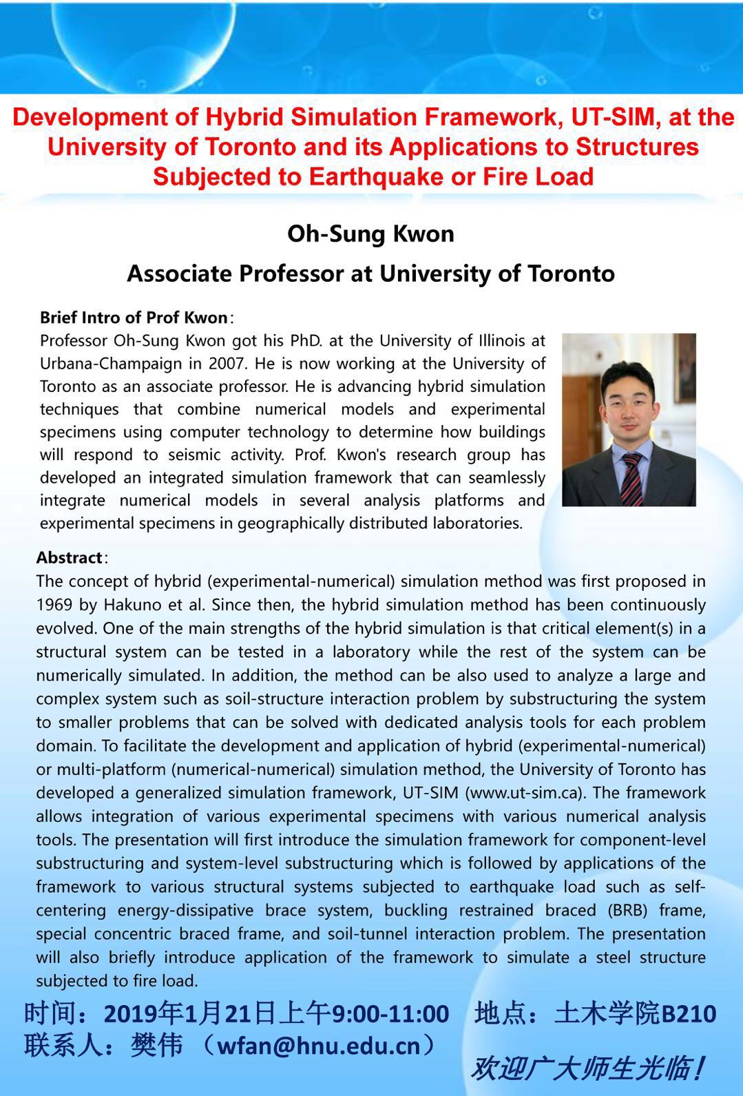 Oh-Sung Kwon:Development of Hybrid Simulation Framework, UT-SIM, at the University of Toronto and its Applications to Structures Subjected to Earthquake or Fire Load