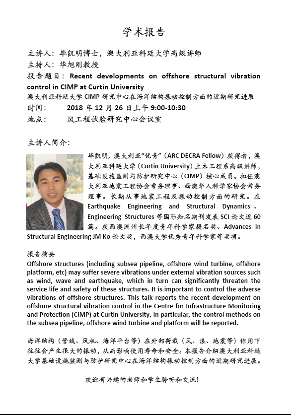 毕凯明:Recent developments on offshore structual vibration control in CIMP at Curtin University