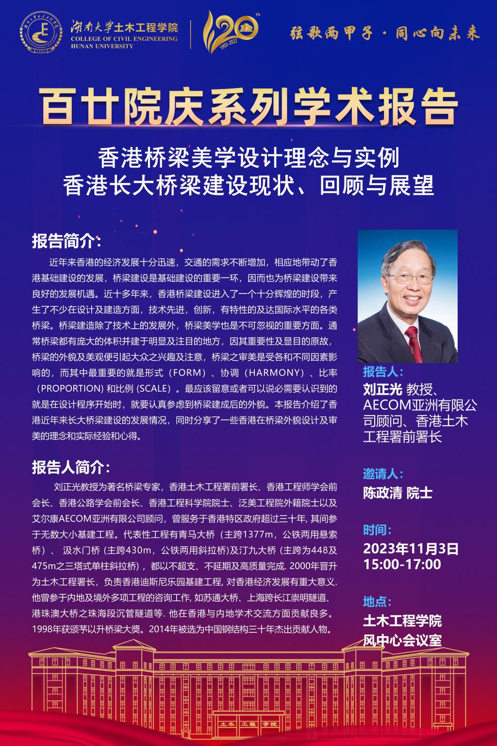 百廿院庆 学术活动|刘正光:香港桥梁美学设计理念与实例/香港长大桥梁建设现状、回顾与展望