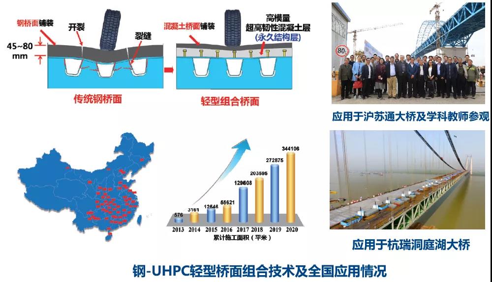 团队还研发了相适应的施工、修补、拆除等系列关键技术,建立了成熟的设计理论、施工方法和检验标准,实现了在高寒、酷热、强震、腐蚀等不同严酷环境中的新、旧钢桥的规模化应用。该成果已成功应用于100余座桥梁,包括主跨1480m的杭瑞洞庭湖大桥、主跨1092m的沪苏通长江大桥、海文跨海大桥、马尔代夫中马友谊大桥等国内外重大工程,节约全寿命成本上百亿元。获教育部技术发明一等奖,并入选交通运输部“重大科技创新成果库”。