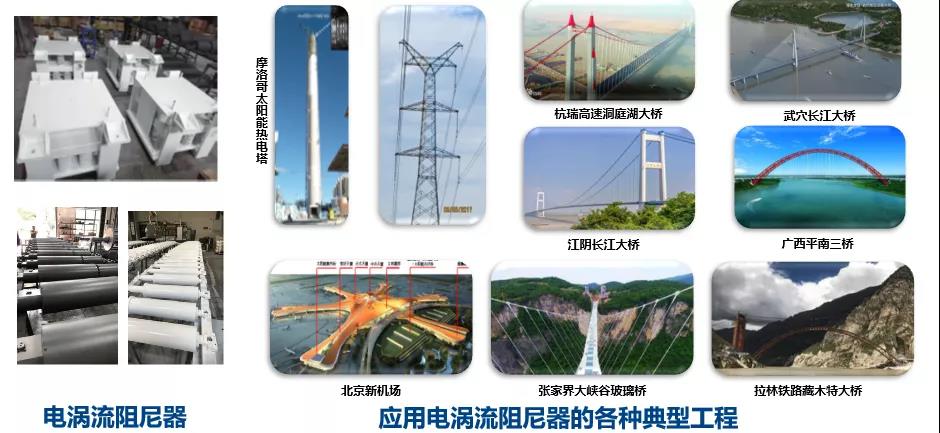 近10年来,针对传统油阻尼器磨损漏油、使用寿命短的缺点,原创性提出电涡流阻尼新技术的概念,攻克了电涡流高性能仿真与设计方法等关键技术难题,研发出电涡流调谐质量阻尼器、大吨位电涡流轴向阻尼器,创新了一种无机械摩擦、无工作流体、无需电源的新型减振技术,实现了启动摩擦力降低90%、全寿命成本减少2/3、耗能效率提高6~8 倍,适用温度从-25~60℃扩展到-80~200℃,从源头上革命性地解决了大型结构减振的世界性技术难题,技术水平处于国际领跑地位。