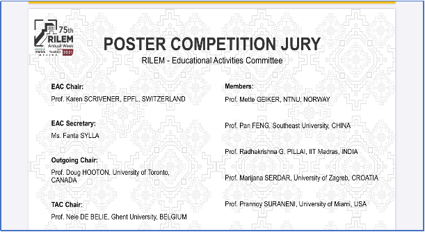 “Poster Competition”是由每届RILEM Annual Week的主办方RILEM主办,其为鼓励年轻学者科研而设立“PhD Courses Poster Award”,评审团皆为国际知名学者。同时主办方也为参赛选手创造与顶尖学者交流学习的机会,设立国际知名学者课程,如Karen教授的“Hydration and Microstructural Characterization of Cementitious Systems”,因而该比赛吸引了来自世界各地的年轻学者。