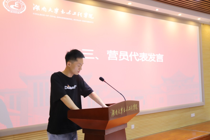 营员代表胡家骏同学对自己在湖大土木院的学习和生活进行了总结,并描绘了对未来的规划和期望。