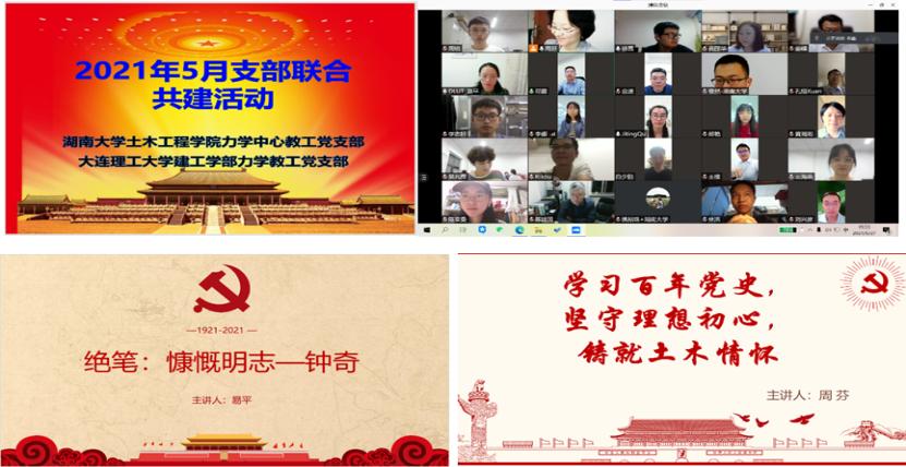 工程应用力学研究中心党支部(简称“力学中心党支部”)和大连理工大学建工学部力学党支部(简称“大连理工力学党支部”)跨校联合开展线上党课,开展“学史崇德”党史学习教育活动。活动由力学中心党支部书记周芬主持,大连理工力学党支部书记易平、力学中心党支部书记周芬分别主讲题为 “绝笔:慷慨明志—钟奇”、“学习百年党史,坚守理想初心,铸就土木情怀”的党课。两个支部的全体教师党员和研究生党员代表共计四十余人参加了本次活动。