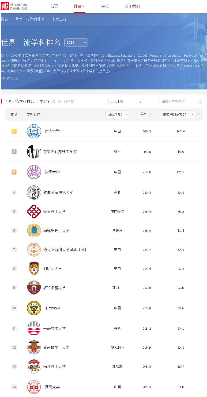 近日,上海软科正式发布软科世界一流学科排名(ShanghaiRanking's Global Ranking of Academic Subjects),av漫画 土木工程学科的排名持续上升,2021年位列世界第14位,中国内地高校第4位。