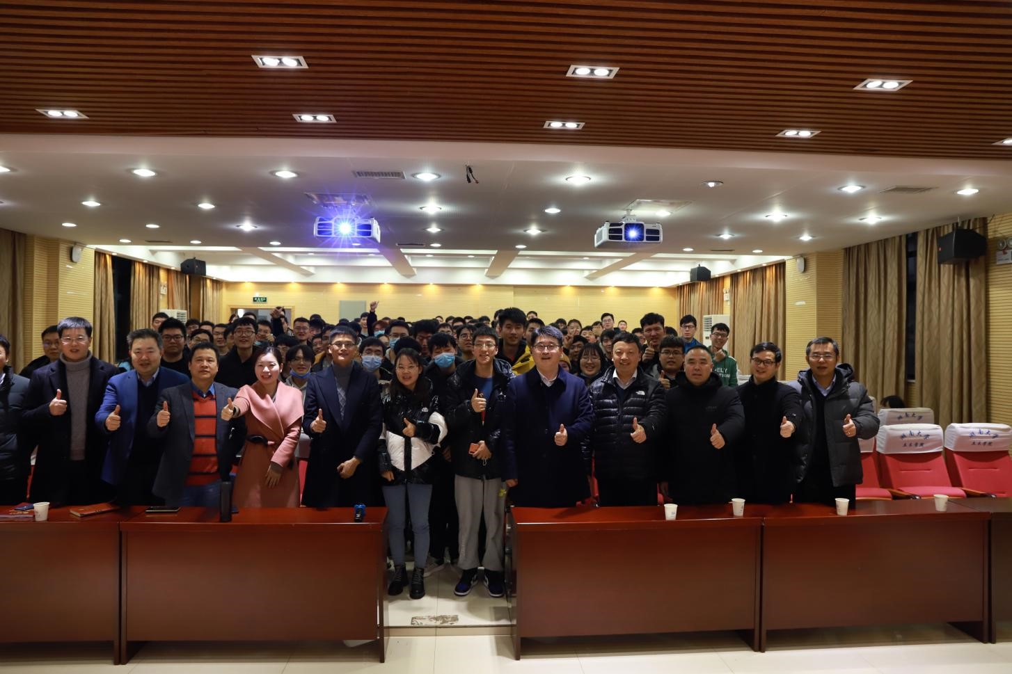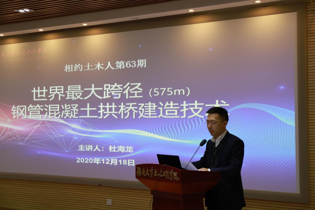 2003届校友,2020年“全国十大桥梁人物”获得者杜海龙做《世界最大跨径(575m)钢管混凝土拱桥建造技术》报告,学院领导、相关专业教师及200余名学生代表参加。报告会由邓露教授主持。