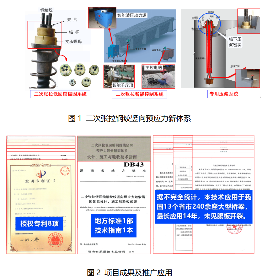 与传统精轧螺纹钢竖向预应力体系相比,二次张拉钢绞线高效竖向预应力具有张拉应力高、延伸量大、回缩损失小、施工简便、质量可控、验收有据等显著技术优势,节省竖向预应力造价15%。成果已应用于重庆鱼洞长江大桥(主跨260m连续刚构桥)等全国240余座混凝土梁桥中,最长应用14年,箱梁腹板未发现开裂现象,经济社会效益显著,具有广阔的推广应用前景。