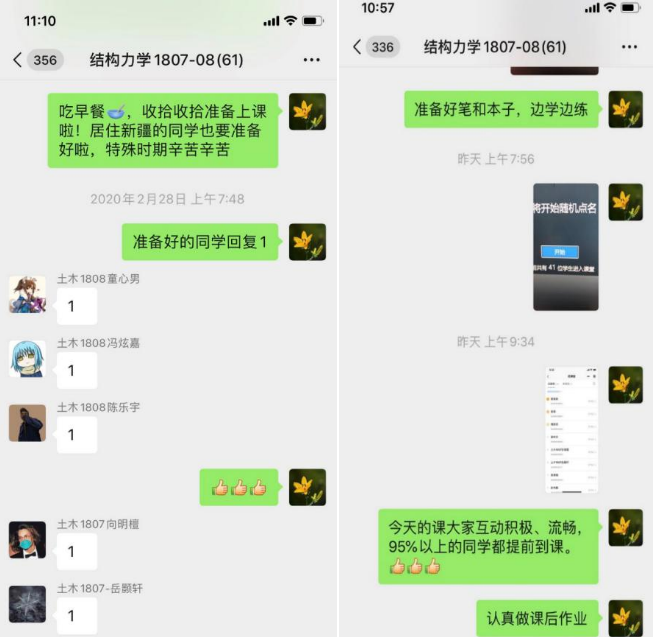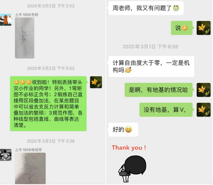 周老师还开展了题为“我和结构力学”的教学活动,关注同学们在家中的实际学习状况。由于课程在上午12节,周老师每次课前会早早督促同学们做准备,提前进入课堂。对于新疆的同学来说,早上8点上课任务比较艰巨,但他们也克服了重重困难,家中没有特殊事情的情况下都能及时到课完成学习。两个班的同学在课程学习的过程中互帮互助,学习氛围浓厚。