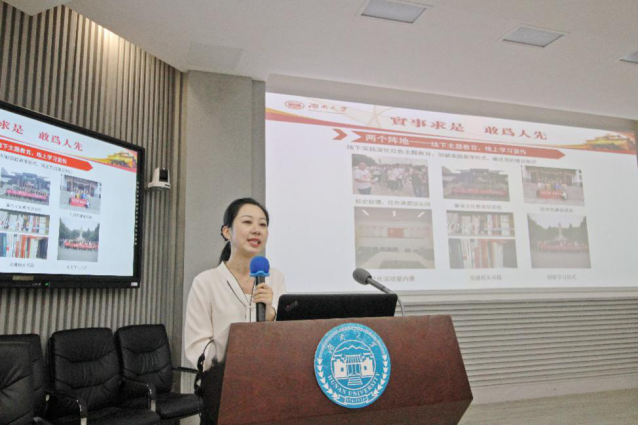 会议在深情悠扬的歌声中缓缓拉开序幕,全体参会人员饱含对新中国成立70周年的美好祝愿,齐唱《歌唱祖国》。歌声落幕,学工办党建专干彭薪羽老师就学院党建工作及规程进行了简要介绍。彭老师围绕党建“123工程”:一条线,两个阵地,三支队伍,展开了详细的讲解:以思想引领、行动引领、人才引领为主线,线下主题教育和线上学习宣传为阵地,党建工作先锋组、习小组、优秀党员宣讲团为队伍,开展学院党建工作。