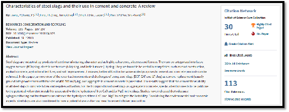 文章刊发于2018年9月的《Resources, Conservation and Recycling》,主要回顾并总结了三大类钢渣的基本属性及其在水泥混凝土领域的应用。依据ESI数据,截至2019年6月,文章在Web of Science Core Collection期刊中的引用量为30,位于此领域同年份发表文章的前0.1%,同时获评ESI热点及高被引文章。