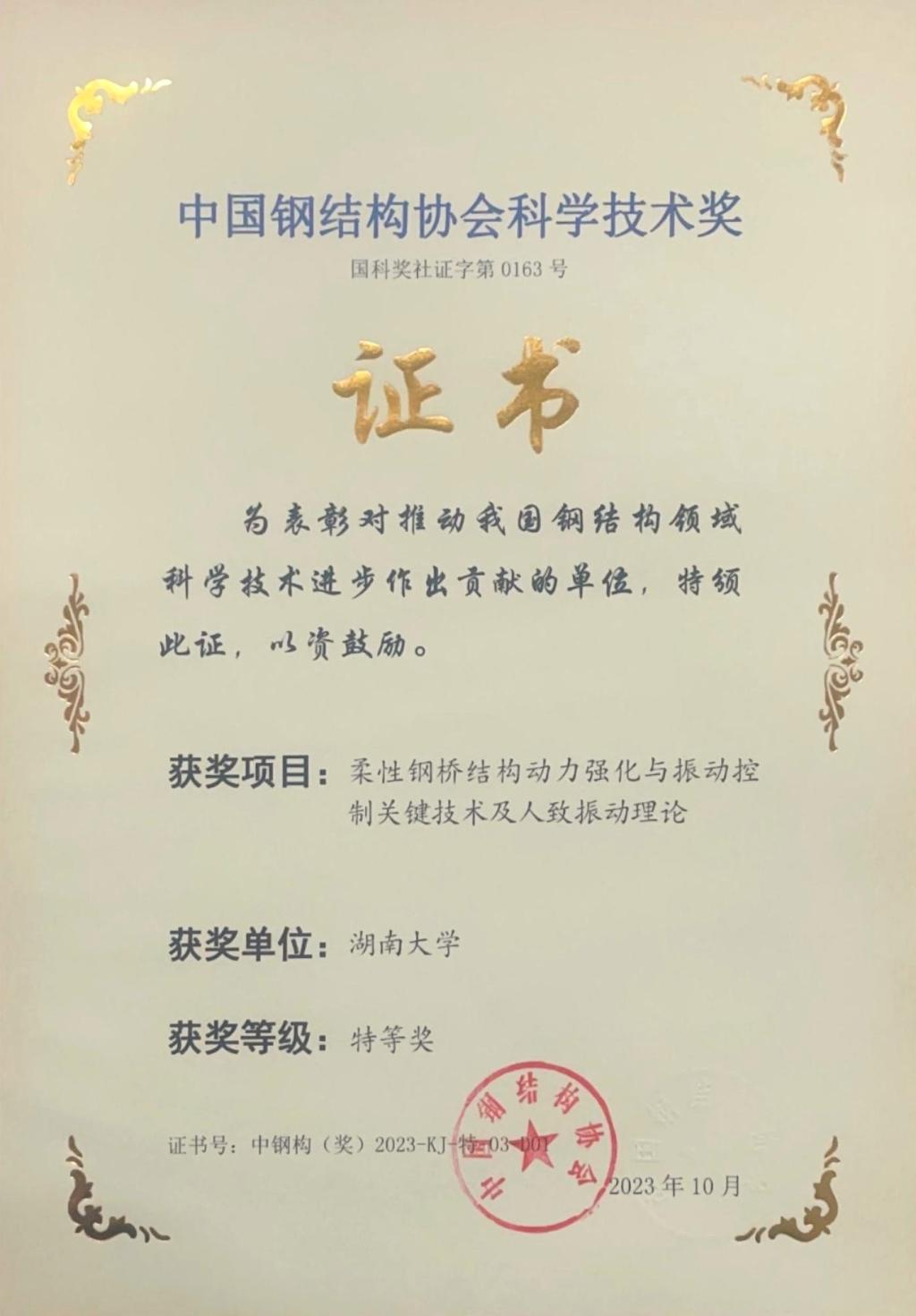 近日,2023年度中国钢结构协会科学技术奖颁奖大会在成都举办,共评选出了科学技术奖90项,其中特等奖5项,一等奖31项,二等奖54项。学院华旭刚教授牵头完成的《柔性钢桥结构动力强化与振动控制关键技术及人致振动理论》项目荣获2023年度中国钢结构协会科学技术奖特等奖。