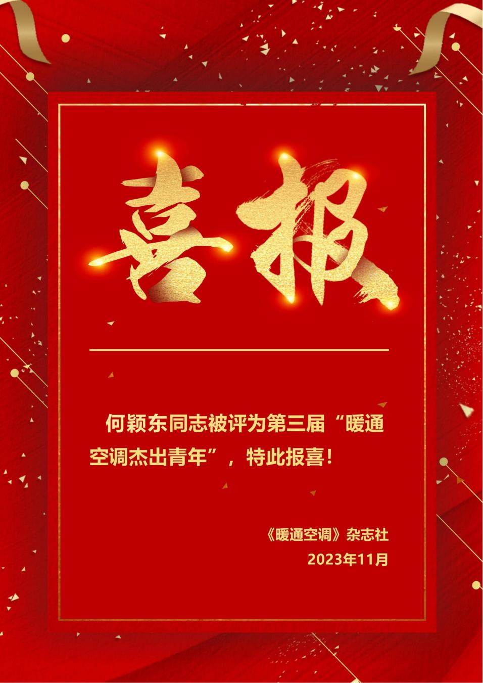 近日,在《暖通空调》杂志社主办的第三届“暖通空调杰出青年”评选活动中,经个人申报、资格审查、专家评审和网络投票等环节,学院副教授何颖东荣获第三届“暖通空调杰出青年”荣誉称号。