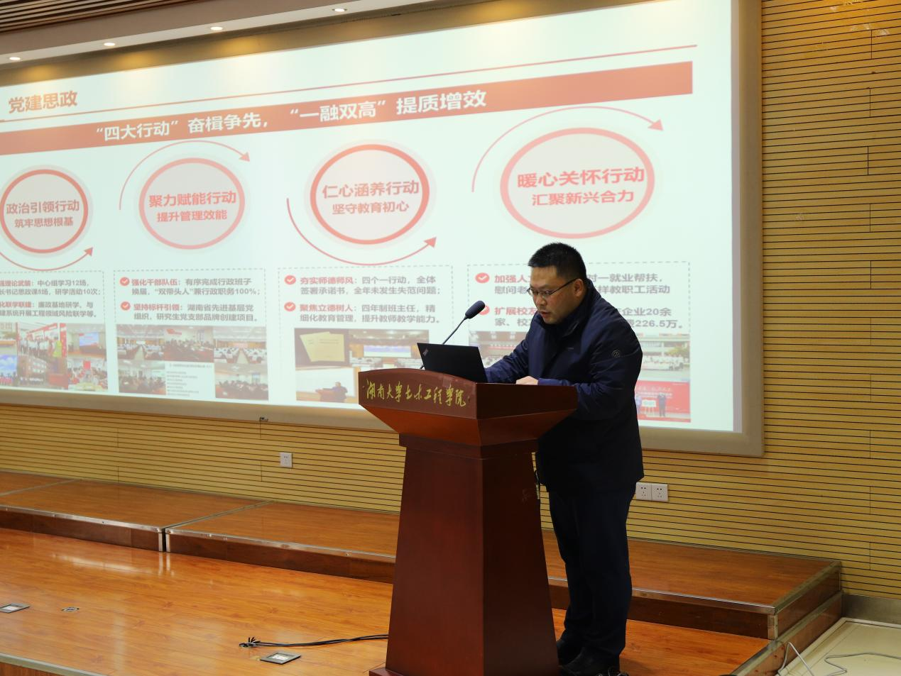 刘文代表学院党委进行述职,从主要工作成效、亮点工作案例、存在的问题及下一步举措、个人履职情况等方面做了总结报告。刘文指出,2024年,学院切实发挥党委、党支部在开展“有组织的科研”的政治优势与组织优势,把服务国家重大战略需求作为各党支部“三会一课”、主题党日的重要议题,把破解科研创新遇到的困难纳入党委重要议事日程,定期跟进研究落实,扎实推进“一融双高”。