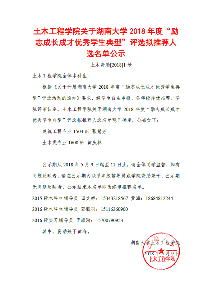 关于2018年度“励志成长成才优秀学生典型”名单公示