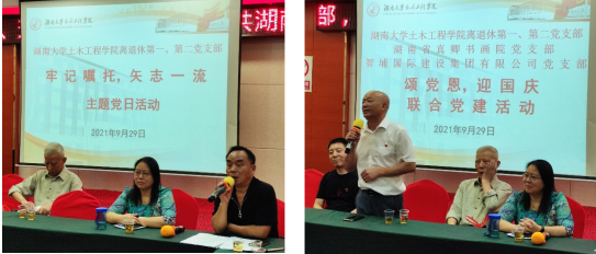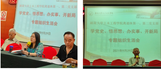 会议第二阶段是土木学院离退休第一、第二党支部“牢记嘱托 矢志一流”主题党日活动。邓铁军书记首先发言,他回顾了去年习近平主席参观岳麓书院的场景,同时谈了自己对双一流建设的认识。他退休这两年正是土木学院工程管理专业国家一流专业申报的关键时期,作为专业的领头人,虽然退居二线,他不遗余力做了大量工作,最近还跟学院领导、工程管理系主任等同志到武汉、天津等地参加会议,走访兄弟院校,希望扩大影响,为今年的双一流专业评选做最后的冲刺。会上,施楚贤等同志也先后发言,就双一流建设、新冠疫苗的接种和摸底等工作提出了建议和意见。