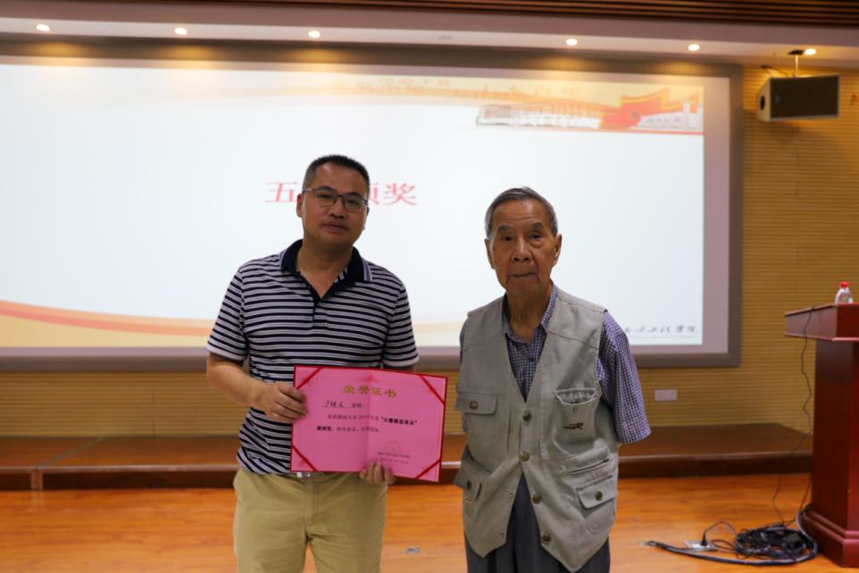 汤广发为2019年度岳麓暖通基金教师奖获得者卢继龙颁奖。